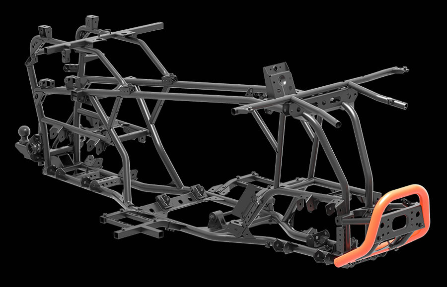 Rama została wykonana ze stali o podwyższonej wytrzymałości, co zwiększa jej odporność na skręcanie i uderzenia. Projekt konstrukcji poprawia rozkład masy, co przekłada się na lepszą przyczepność i stabilność podczas jazdy po nierównym terenie. Wysoki prześwit i kompaktowa budowa sprawiają, że ATV bez problemu pokonuje przeszkody i trudne trasy leśne, polne czy górskie.