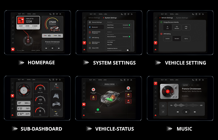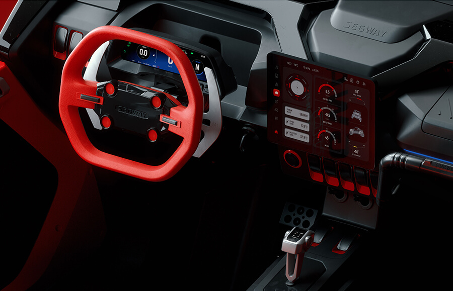 Za pomocą aplikacji Segway Powersports możesz: otwierać pojazd (AirLock), analizować dane, śledzić GPS, aktywować funkcje lub sprawdzić status baterii i silnika. Wszystko też widoczne na ekranie dotykowym w kokpicie.
